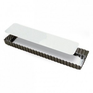 Pre-order product (+/- 8 days + delivery)Oblong fluted tart mould, loose bottom, non-stick. L top 350 mm L bottom 340 mm W top 110 mm W bottom 100 mm ?H 25 mm