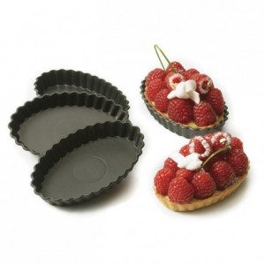 "Royal" oval mould Exopan . Blister pack of 25. Fine steel with a non-stick coating inside and protective enamel outside. Ideal for cooking pastry, the Exopan combines the quality of cooking in tinplate with the simplicity of use of a non-stick surface. The fineness of the steel contributes to developing the colour of the products. Simply wipe...