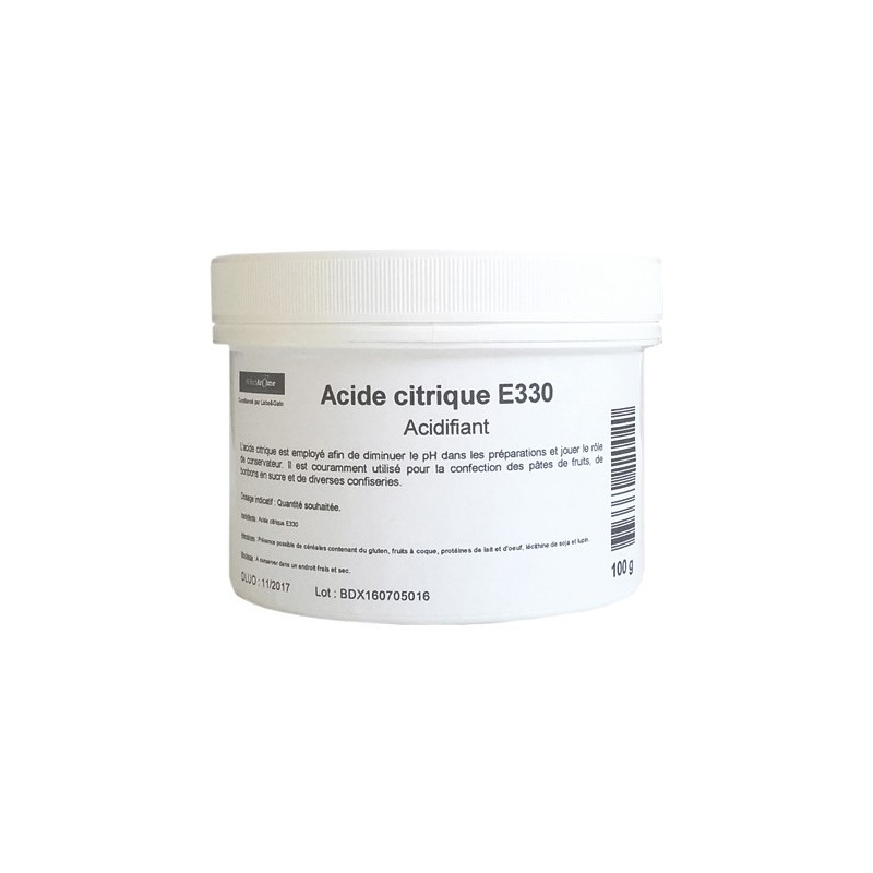Le dosage de l'acide citrique est fonction de votre utilisation. Le plus classique, pour une confiture ou une pâte de fruit, il convient de compter 2/3 g d'acide citrique en solution (additionné de 2/3 g d'eau) par kg de préparation.