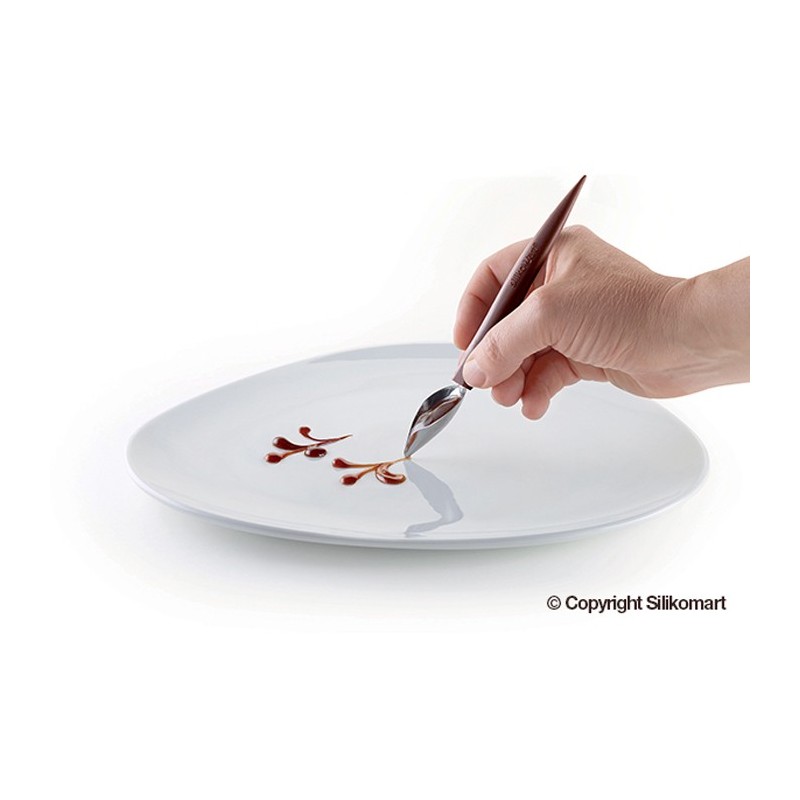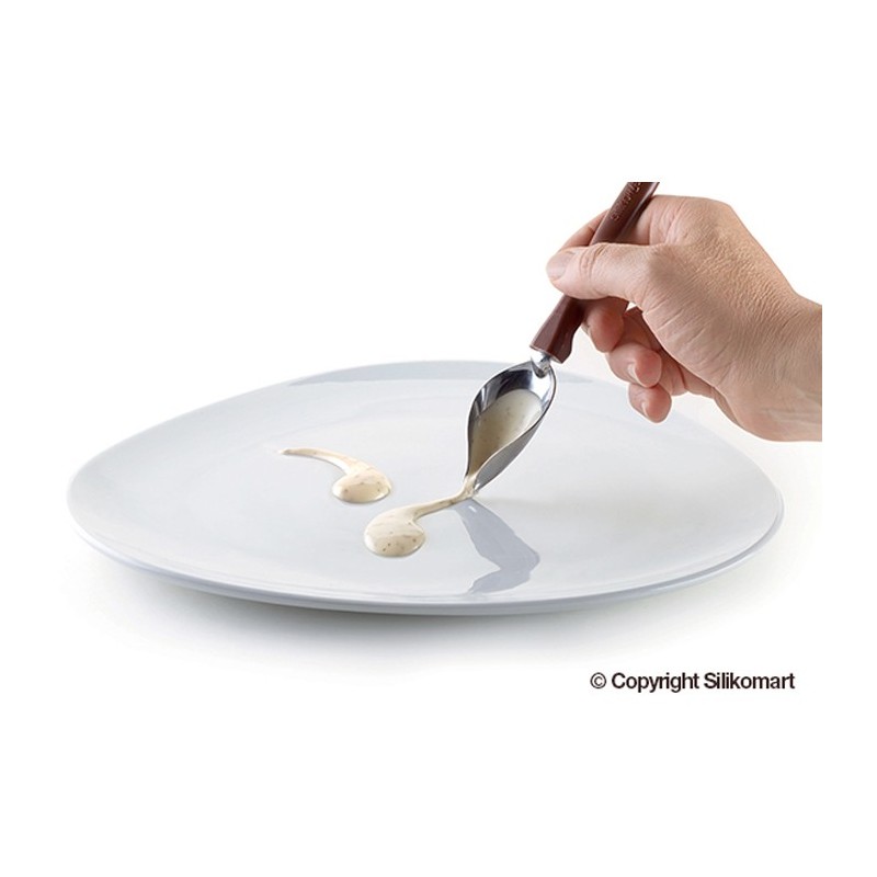 Instructions: In a small container, draw with Spoon Decor a small amount of sauce and lay the tip of the spoon vertically in relation to your dish, running the tip on the porcelain. You can obtain a solid and defined line. You can superimpose the lines of colour and mix lines with punctuation.