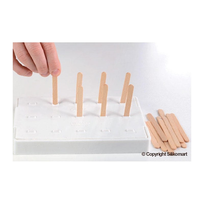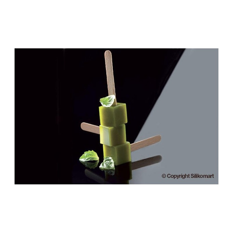 The perfect fusion between geometrical shapes and elegance generates the platinic silicone moulds Mini Kube, Mini Pick and Mini Bar, perfect to prepare refined individual portions shaped as cubes, half cylinders and rectangles. They are perfect to make greedy chocolates on stick, tasty mini ice-cream finger food and also one bites in savoury version. The moulds resist to temperatures going from -76°F to +446°F, allowing their use in the oven and in the blast chiller. The package is composed by two moulds to make Mini Sticks, one polycarbonate black tray 12x40 cm (0.47x1.57 inches) and 50 wood sticks.
