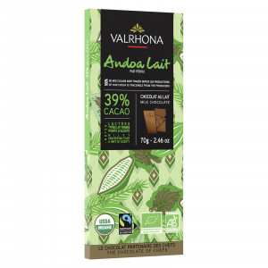 Tablette de chocolat noir biologique et équitable Valrhona Andoa Noire 70% de cacao, Mariage de Grands Crus. Pur beurre de cacao Frais et Amer. Ce Grand Chocolat offre une attaque en fraîcheur et une amertume puissante et exceptionnelle qui se développent et se nuancent au cours de la dégustation.