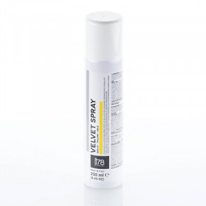 Spray velours blanc. Colorant alimentaire à base de beurre de cacao. Pulvérisé sur l’entremet préalablement passé au congélateur, il le recouvre d’une fine couche d’aspect velours. Aérosol simple et facile à utiliser entre 20 et 25°C. Chocolat blanc.