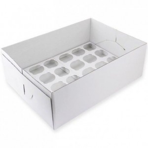Sur commande (+/- 15 jours + livraison)Boite à cupcakes 14 cm 24 pièces Avez-vous préparé de délicieux cupcakes pourvus de grandes décorations ? Transportez ces cupcakes extra hauts dans cette boîte de PME ! Cette boîte a une hauteur de 14 cm et est fabriquée en carton blanc robuste. Grâce à son couvercle à part et ces inserts avec espace supplémentaire, elle est facile à utiliser. Conseil...