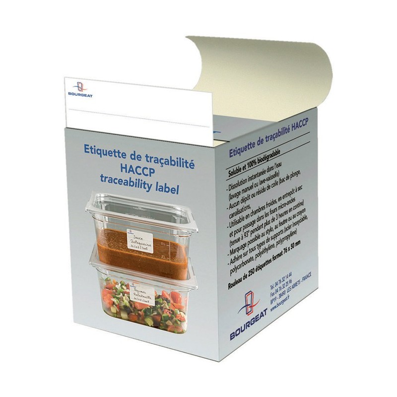 Adhère sur tous types de support. les étiquettes d’identification HACCP sont présentées en rouleau de 250 pièces dans une boîte distributrice de protection avec languette intégrée pour séparation de l’étiquette de son intercalaire lors du déroulement.