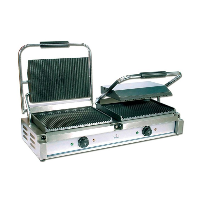 2 plaques surface de contact : 340 x 220 mm. Réglage indépendant du thermostat de 50° à 300° C. 2 prises de courant séparées.