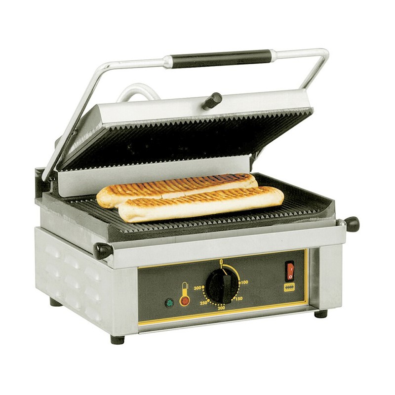 Grill conçu pour la cuisson simultanée de 2 paninis. Plaque supérieure auto-balancée avec ressort de pression réglable. Surface de contact 360 x 240 mm. Plaque inférieure et plaque supérieure rainurées. Thermostat de régulation de 0 à 300°C. Tiroir ramasse-jus amovible. Les plaques fonte assurent une cuisson homogène.