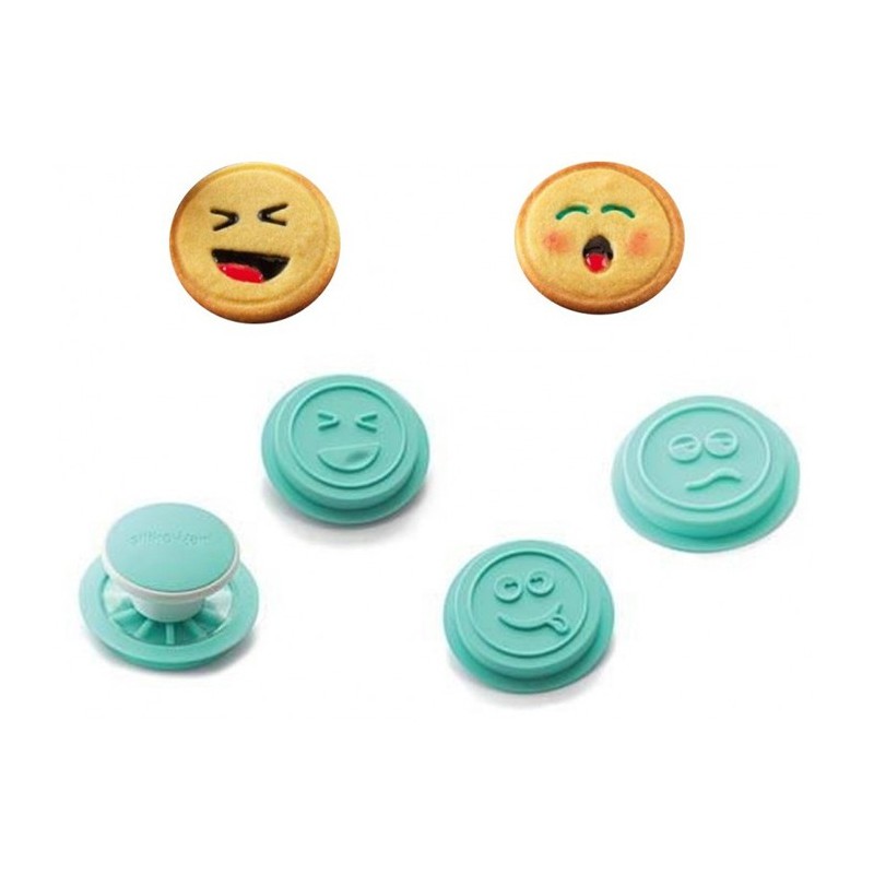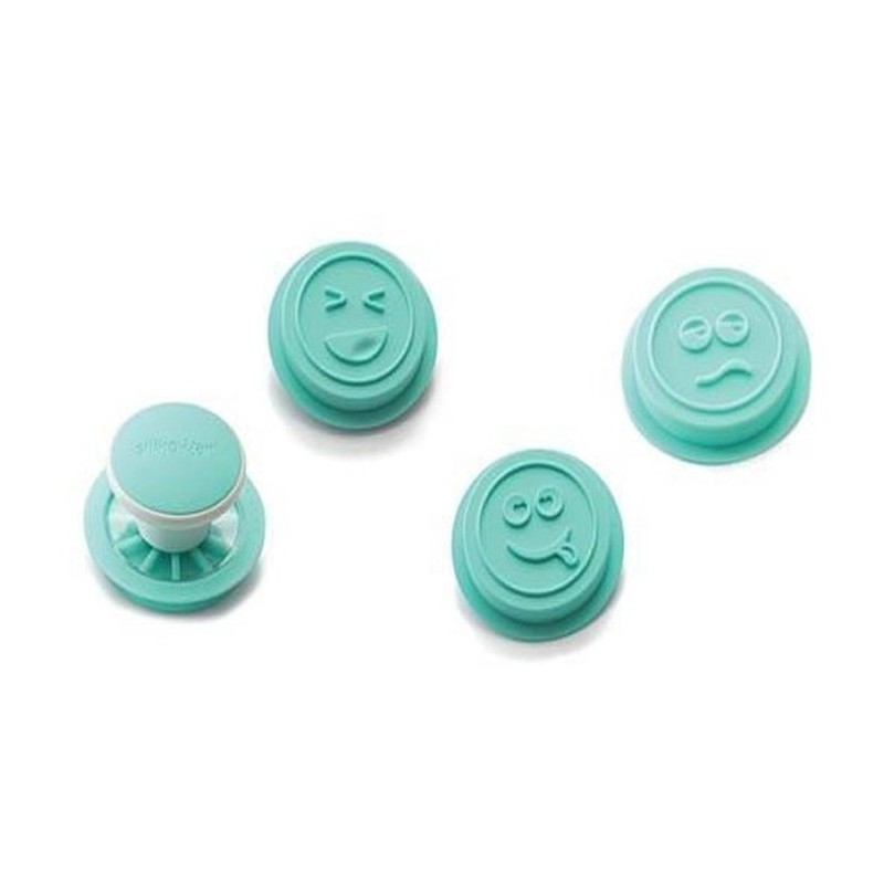 Avec le kit Wonder Stamp vous pouvez imprimer directement dans vos cookies vos humeurs, et servir à table vos émotions ! Tout ça est possible grâce à l'emporte-pièce rond transparente et aux quatre disques en silicone en forme de 'smile' de couleur vert tiffany, chacun avec une expréssion différente, pour des biscuits et des bonbons drôles et divertissants.