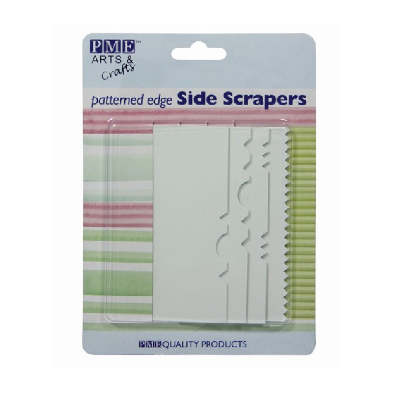 Jeu de 4 racloirs en matière synthétique à motifs divers pour travailler le glaçage ou la crème au beurre.