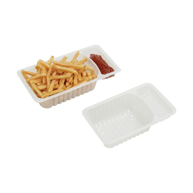 Barquettes thermoformées avec un compartiment séparé de 6 cL pour la sauce moutarde, ketchup ou mayonnaise.