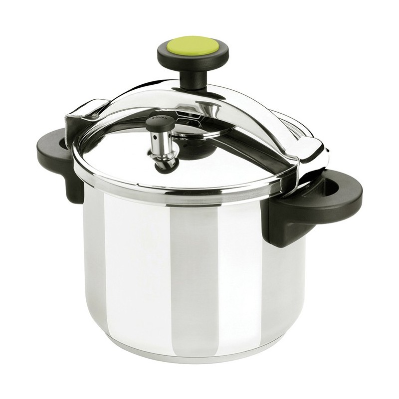 En acier inoxydable, fond sandwich inox/alu/inox, joint silicone, poignées et bouton remplaçables.