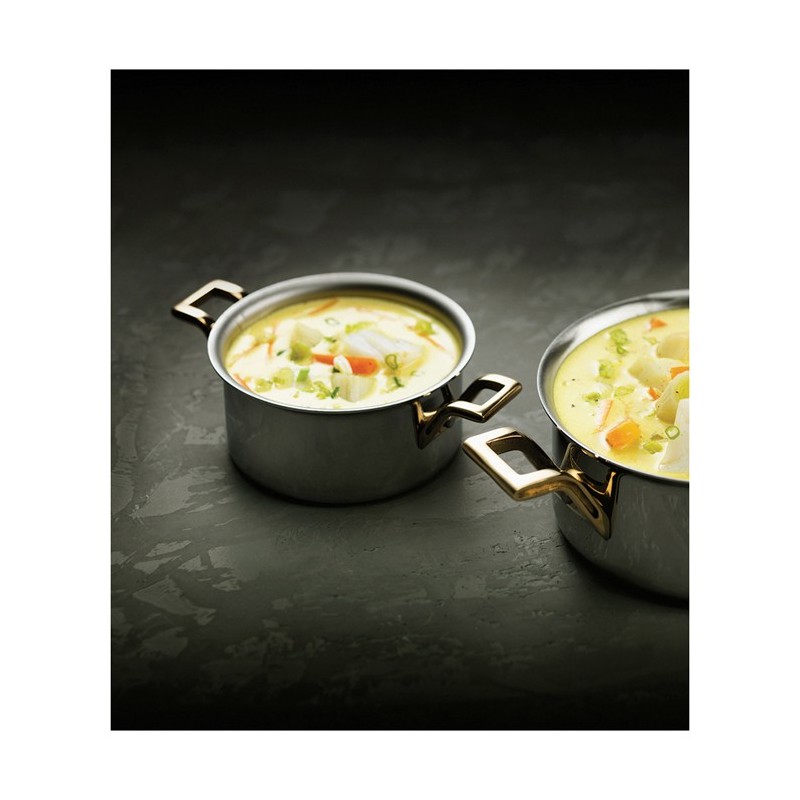 Petite marmite à anses en laiton poli destinée au service en « Front Cooking » et sur les buffets, en portion individuelle.