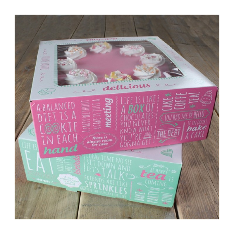 La boite à gâteaux en vert et rose possède une fenêtre et de par sa hauteur, elle convient également pour des gâteaux décorés.
