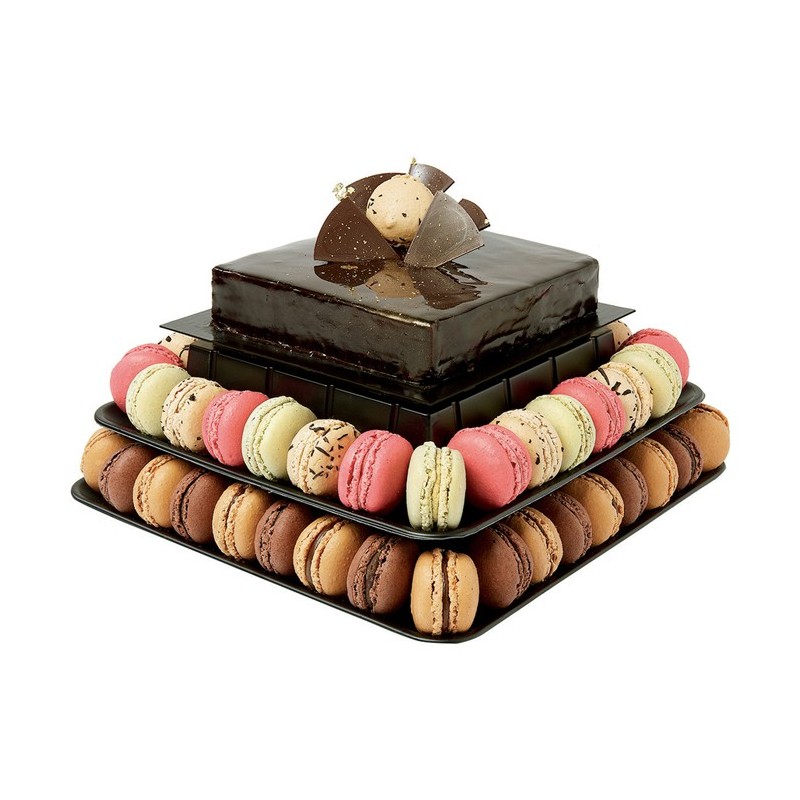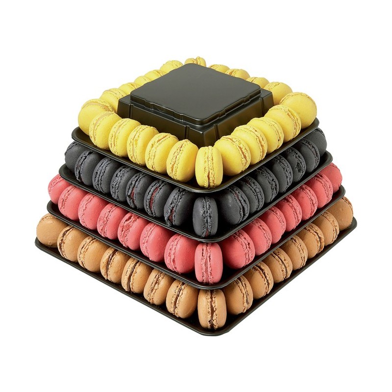 Plateaux en PVC thermoformé. Une base croisée offrant une parfaite stabilité est disponible en option pour rehausser la pyramide.
