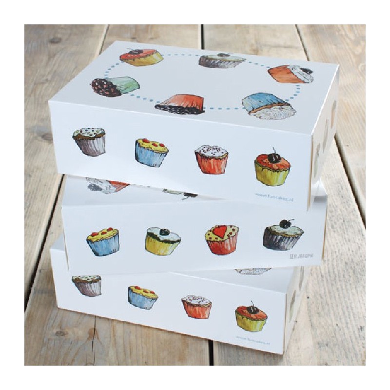 Ces solides boîtes en carton avec leur ravissant motif sont non seulement fonctionnelles mais aussi de bon goût pour offrir des cupcakes ou des muffins en cadeau. Le design de cette boîte à cupcakes est la reproduction d'une oeuvre d'art peinte à la main du peintre G. Zaagsma. L'insert permet aux cupcakes de rester bien en place dans la boîte.