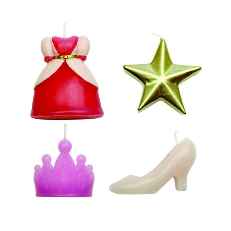 Réalisez un vrai gâteau de princesse avec ces bougies qui contiennent : une étoile, une couronne, un escarpin et une robe.