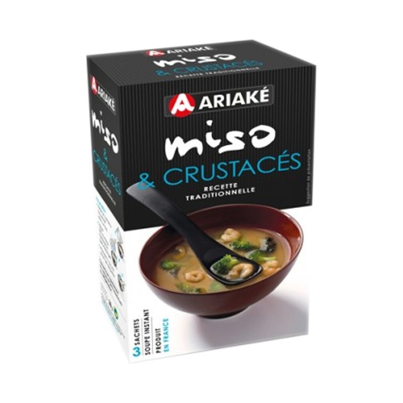 Ingrédients : 85% de Miso (eau, fèves de soja, riz, sel), pointe de brocoli et de bonite, crevettes roses et algue marine wakamé.