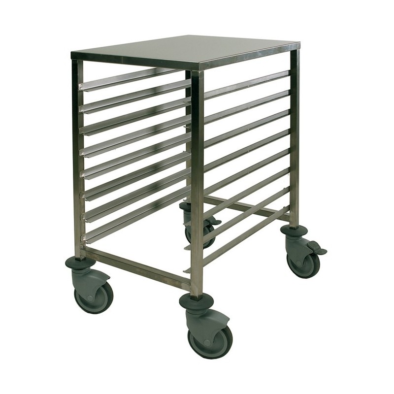 Chariot dont le dessus insonorisé en inox peut servir de plan de travail mobile ou de support pour une machine.