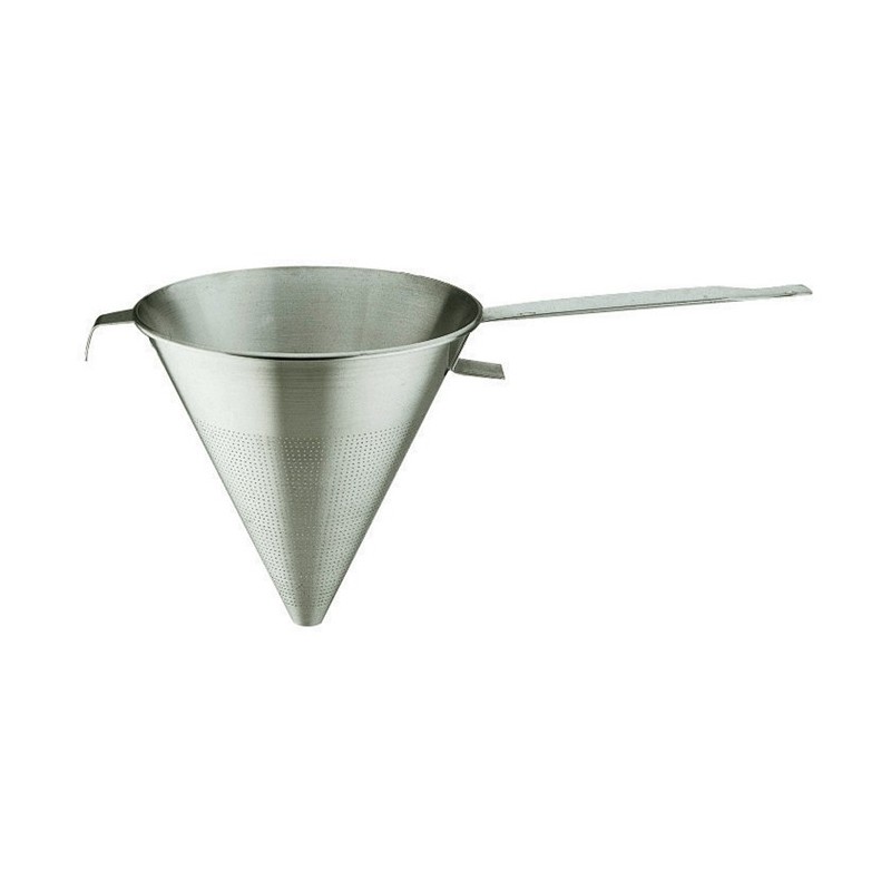 Passe-sauce dit chinois. Conique, embouti. Acier inoxydable. Crochet et patte d'appui. Perforations fines 1,6 mm.