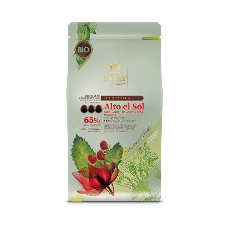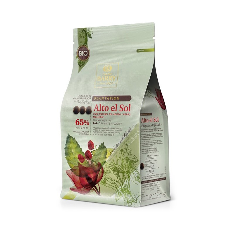 Au coeur d’un parc naturel du Pérou, la plantation Alto El Sol est protégée par un environnement luxuriant qui donne aux cacaoyers toutes ses richesses. L’acidité et les fruits rouges dominants avec une touche de saveur d'olive noire procurent à ce chocolat de couverture biologique noir lto une très longue finale en bouche.