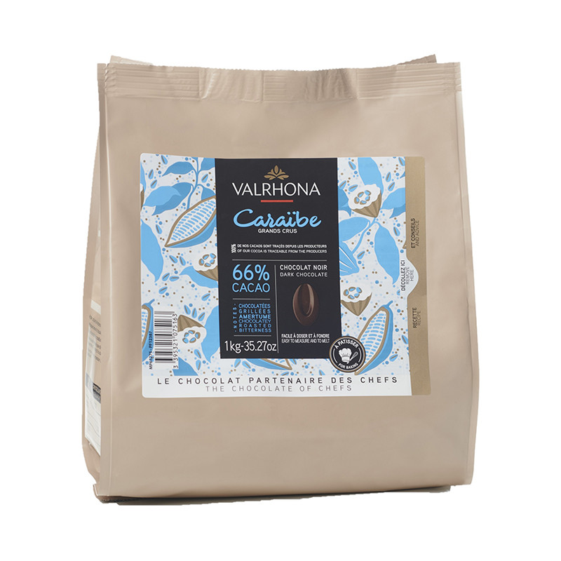 Fèves de chocolat noir Valrhona Caraïbe 66% de cacao, Mariage de Grands Crus.