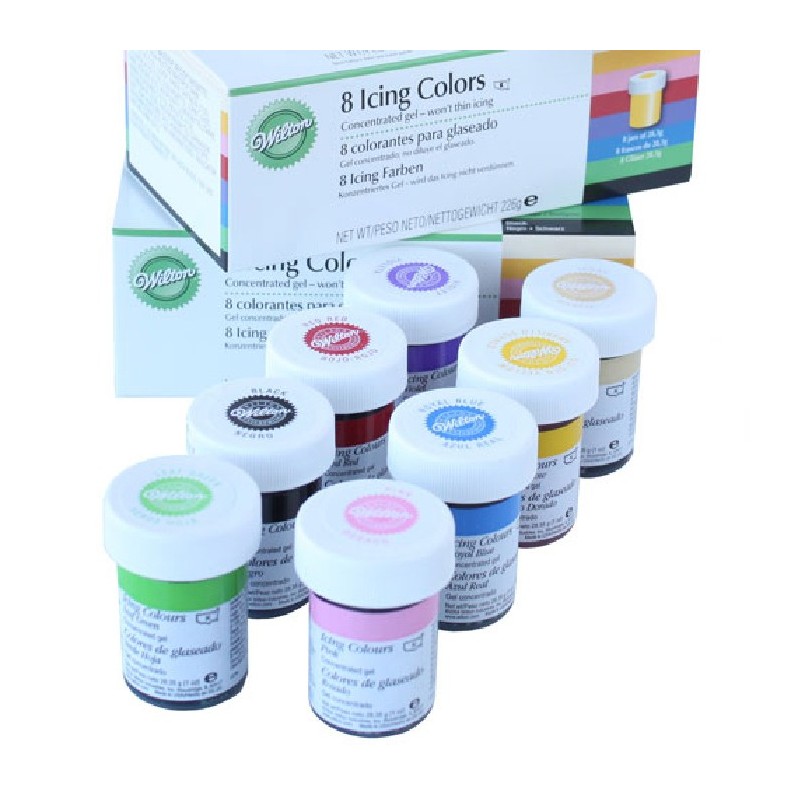 Ensemble de 8 flacons de 28 grammes de colorant alimentaire en gel concentré de couleur Red Red (rouge), Golden Yellow (jaune doré), Leaf Green (vert feuille), Royal Blue (bleu roi), Ivory (ivoire), Pink (rose), Violet (violet) ou Black (noir). Les gels de couleur ne contiennent que des colorants autorisés par l'UE.