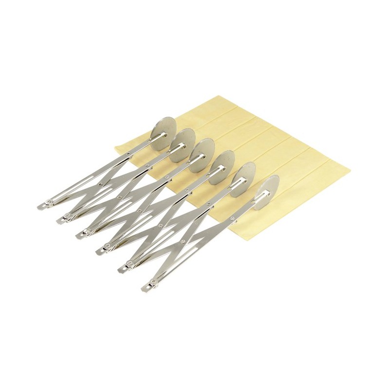 Ce diviseur à pâte extensible doté de 6 roulettes a été conçu pour couper simultanément jusqu’à 5 bandes de pâte et ainsi réaliser rapidement oreillettes, bugnes, feuilletés, linguines, lasagnes… mais aussi pour détailler pizzas et tartes en parts égales. En inox, il passe au lave-vaisselle.