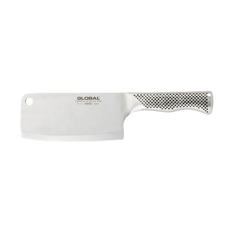 Couperet de cuisine Global G12 « Série G ». Couteau à grande lame et manche rond creux assurant équilibre et prise de main optimum.