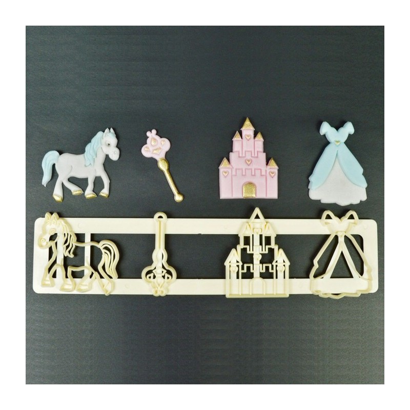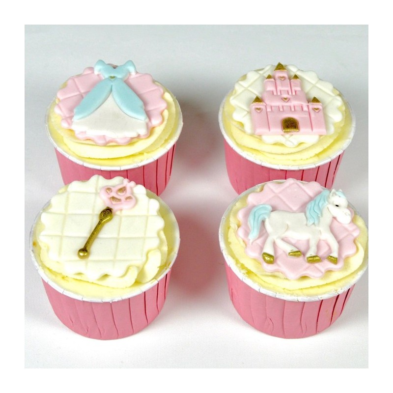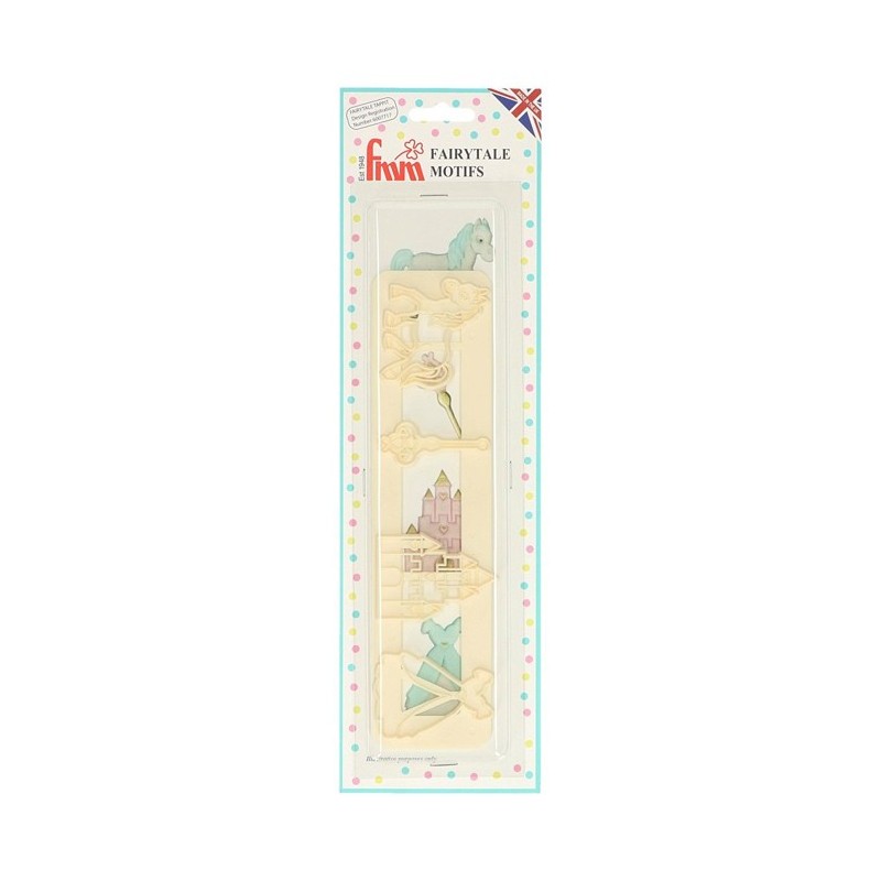 Les Fairytale Tappits de FMM sont idéals pour la décoration de gâteaux , cupcakes et biscuits de princesse et de conte de fées ! Les Tappits contiennent un cheval, une baguette magique, un château et une robe de princesse.