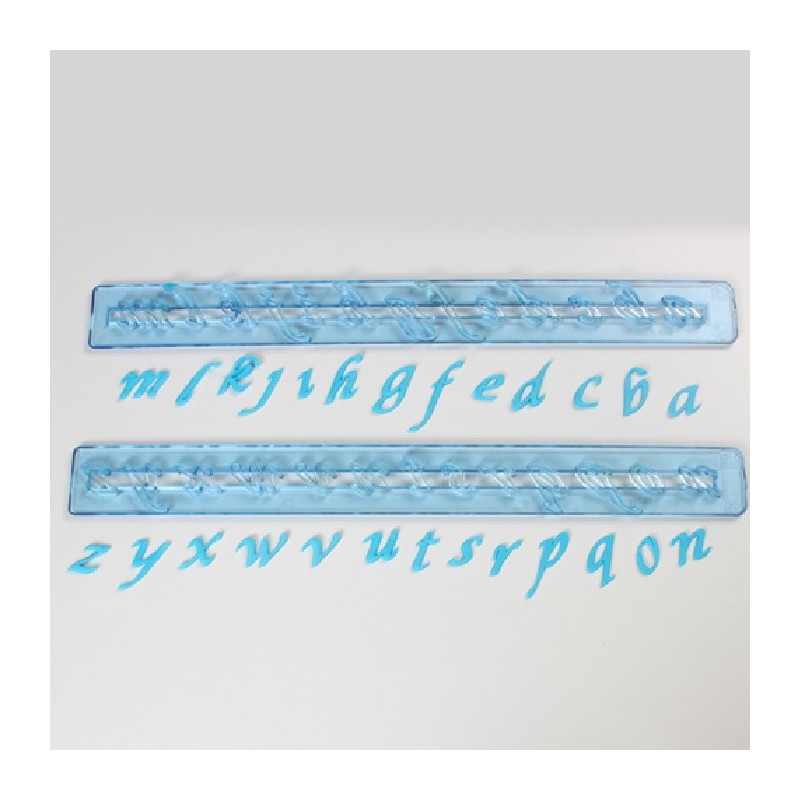 Jeu d'emporte-pièces sous forme de règle pour la confection des lettres minuscules, de a à z. Lettres en italique.