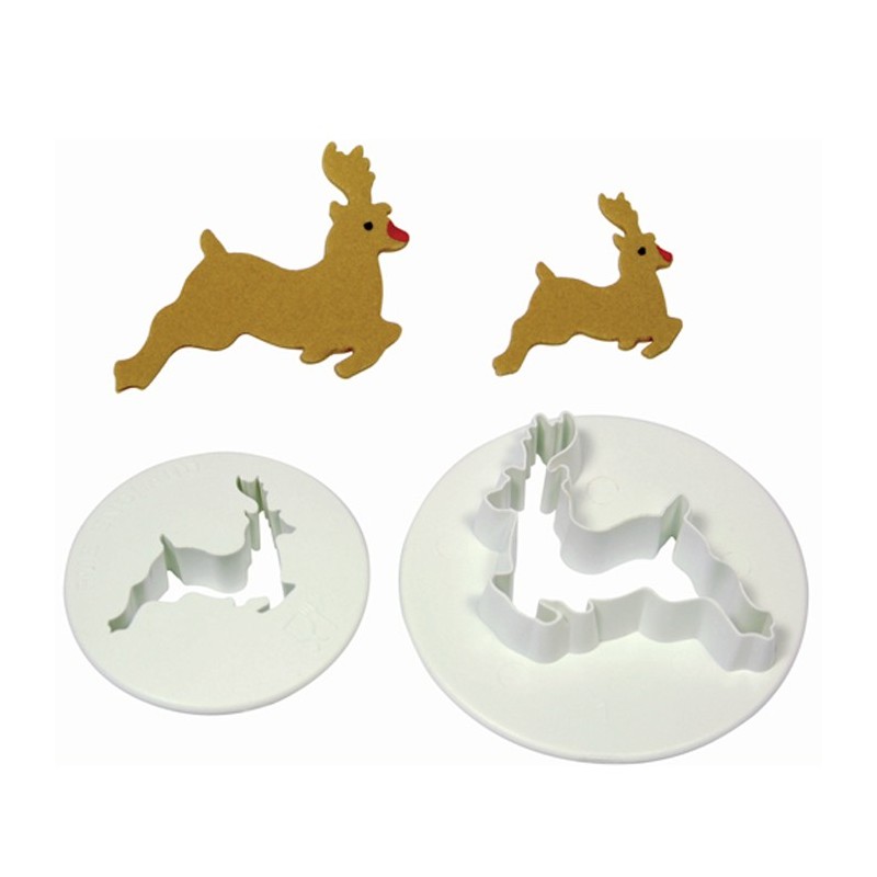 Jeu de 2 emporte-pièces représentant des rennes sautillants. Le grand renne mesure environ 5 cm et le petit, ± 3,5 cm.