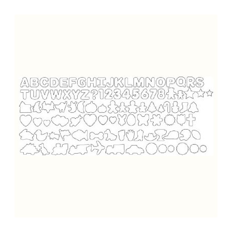 Le kit comprend les lettres de A à Z, le point d'interrogation, les chiffres de 1 à 8, 3 cœurs de tailles différentes, 3 cœurs à bordure festonnée de tailles différentes, un double cœur, un cœur transpercé d'une flèche, une tête de lapin, un œuf, un papillon, une fleur, un soleil, une tulipe, une croix, un lapin, 2 citrouilles de tailles différentes, un fantôme, une lune, un chat angoissant, une maison hantée, une sorcière, une chauve-souris, un garçon, une fille, 2 sapins de Noël de tailles différentes, un bonbon, un bonhomme de neige, un entrepôt, une clochette, un pied, une main, une botte, un chapeau de cow-boy, une étoile filante, un drapeau, 3 cercles de tailles différentes, 3 étoiles de tailles différentes, 3 cercles à bordure festonnée de tailles différentes, un os, un chien, un poisson, 2 ours de tailles différentes, un canard, un stegosaurus, un tyrannosaurus rex, une coupe de champion, une casquette de base-ball, un casque de football américain, une balle de football, un train, une voiture, un avion, un camion de pompier et un camion à benne.