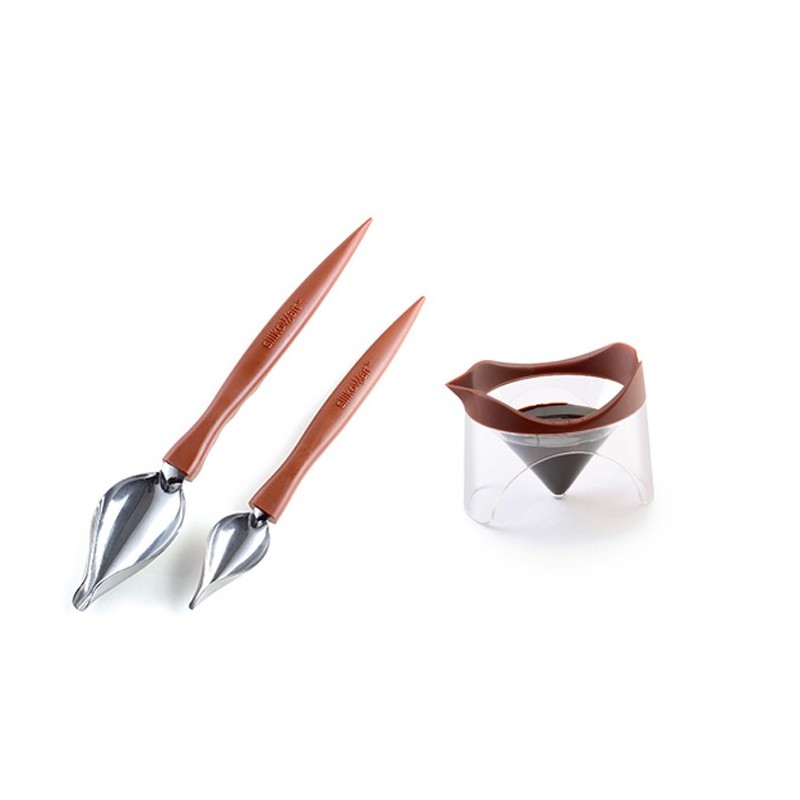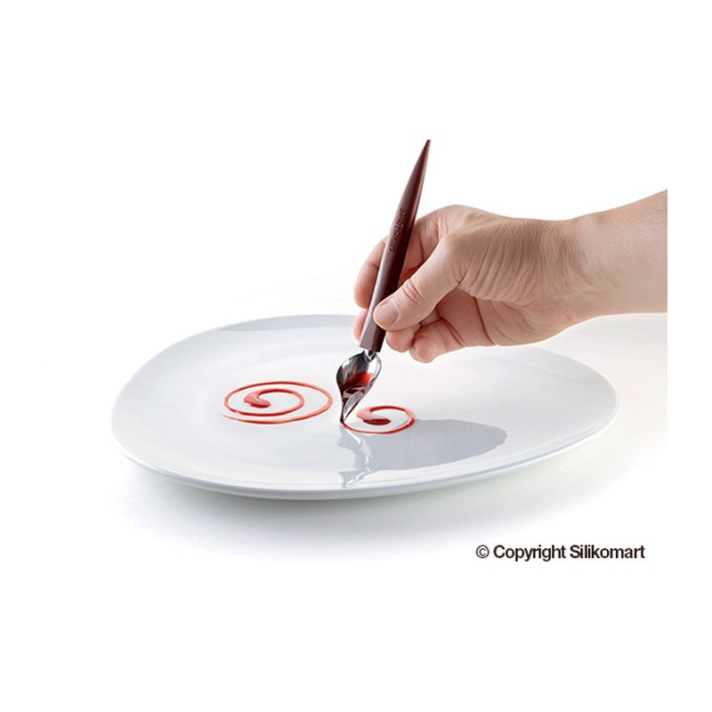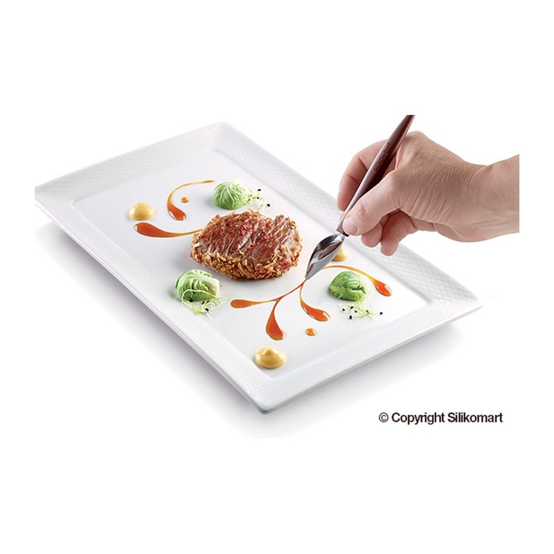 Mode d'emploi: Dans un petit récipient, prélever dans la cuillère plume une petite quantité de sauce et déposer la pointe de la cuillère à la verticale sur votre assiette en glissant la plume sur la porcelaine. Vous pouvez obtenir des traits pleins et déliés. Vous pouvez superposer des traits de couleurs ou combiner traits et pointillés.