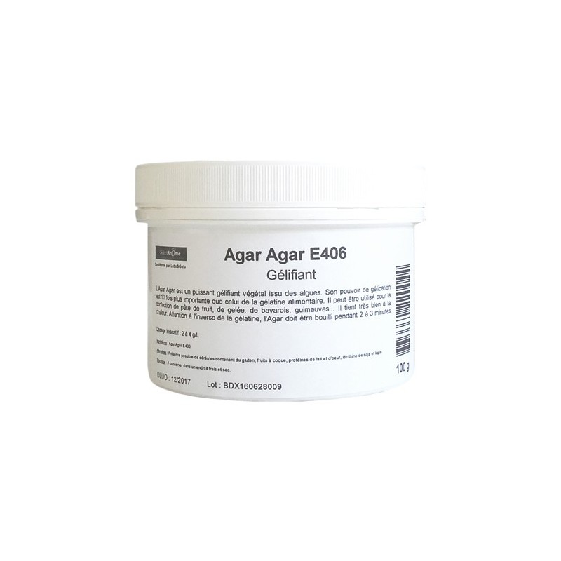L’agar agar est un gélifiant naturel végétal qui permet de remplacer la gélatine animale dans de nombreuses recettes : aspic, gelée, terrine, mousse et chantilly, panacotta, crème, bavarois/entremets, ...etc. Soluble à chaud, le gel est obtenu après refroidissement. Attention tout de même au dosage : l'agar agar est 8 fois plus puissant que la gélatine !