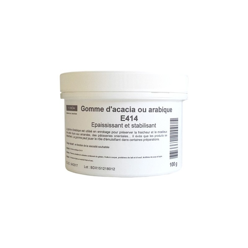 La gomme Arabique est un gélifiant naturel issu de la sève des arbres de la famille des Acacias. Très utilisée depuis des millénaires, elle permet d'apporter une imperméabilité aux pâtisseries et confiseries à bases de fruits à coque (pâtisseries orientales, petits fours, dragées …) grâce à son fort pouvoir émulsifiant. Excellent support d'arôme grâce aux effets adhésifs liés à son taux de ramifications, elle rentre également dans la composition des loukoums, bonbons gomme et des chewing-gums pour sa texture élastique. A la différence de la gomme Xanthane, la gomme Arabique prend sa texture en étant chauffée.