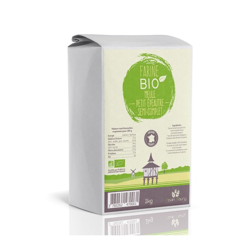 Ingredients : Farine de petit épautre bio* semi-complet écrasé a la meule de pierre.*issu e l'agriculture biologique.