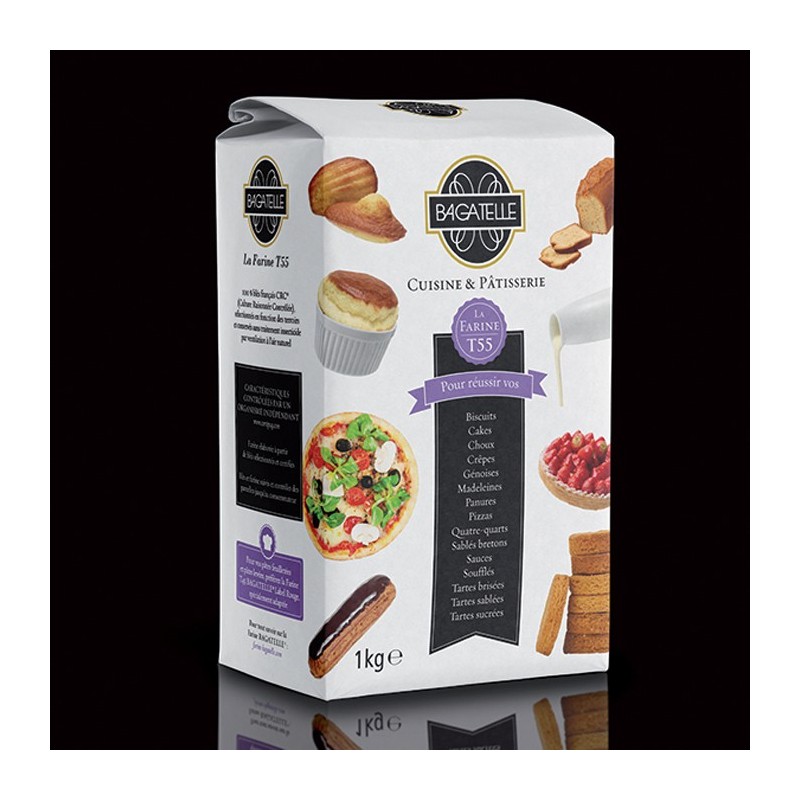 Bagatelle T55, une farine plus faible en gluten avec une bonne extensibilité. Issue à 100% de blés CRC (Culture Raisonnée Contrôlée), cette farine est idéale pour les pâtes tranquilles qui doivent s'allonger et s'étendre sans se déchirer ni ensuite se rétracter à la cuisson : pâte feuilletée, biscuits, pâte brisée, génoise, ...