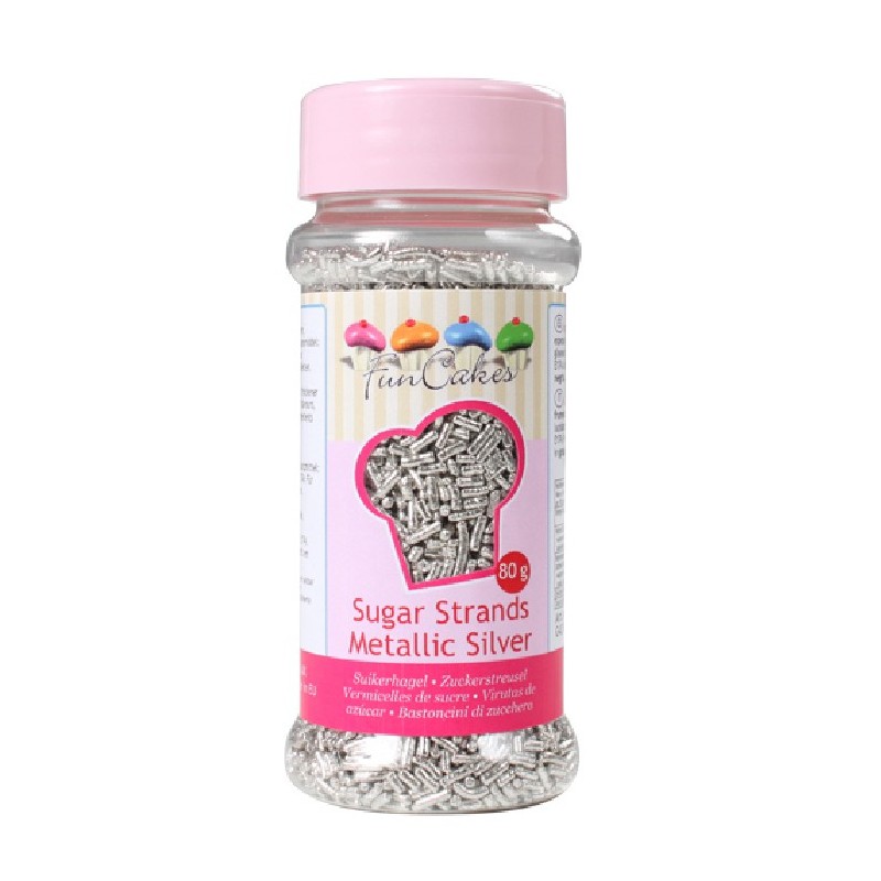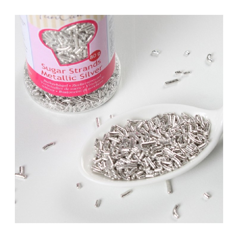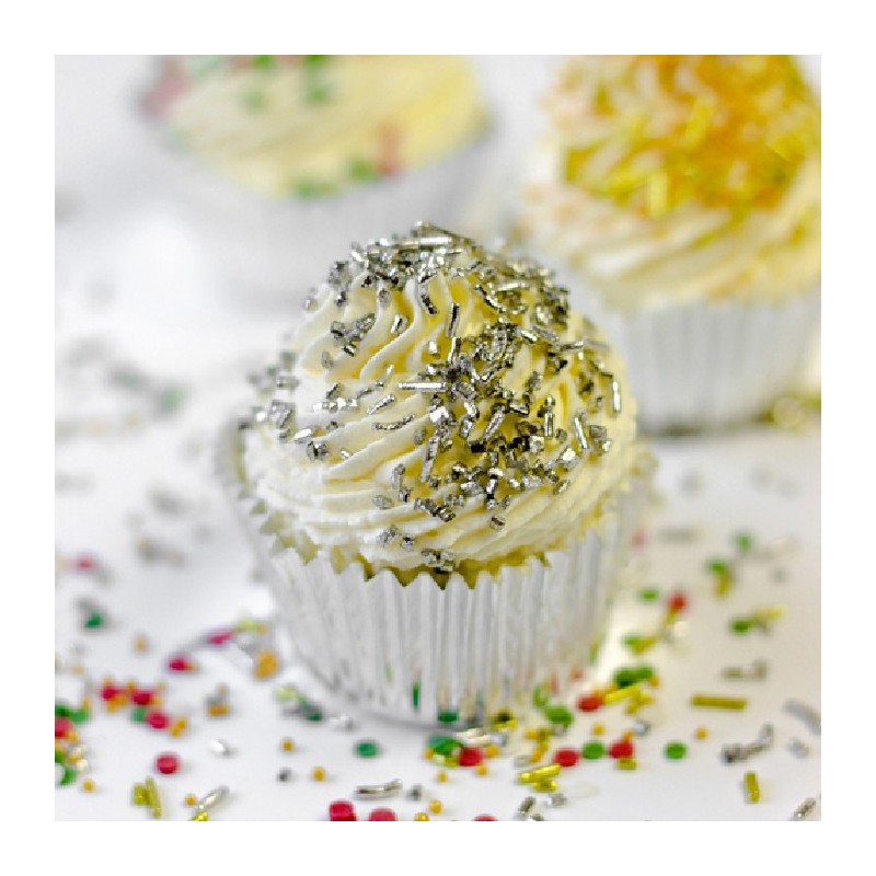 Donnez à vos créations une apparence chic avec les vermicelles en sucre argenté métallisé.
