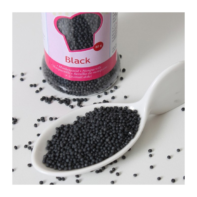 Ingrédients: sucre, amidon (blé, maïs), sirop de glucose, colorant: E153, matière grasse végétale (noix de coco), agent d’enrobage: E901. Ce produit est certifié Halal.