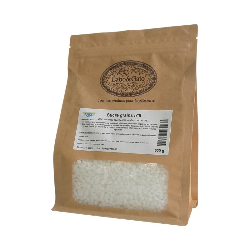 Le sucre en grain est obtenu par moulage à très haute pression de lingots de sucre cristal. Ces lingots sont ensuite concassés et tamisés afin d’obtenir des grains irréguliers d'une très grande dureté, qui résistent à la cuisson, produisant des effets décoratifs et des textures agréables.
