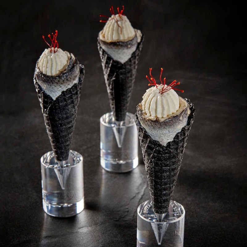 Pour un effet moderne et décalé, La Rose Noire a créé ces cônes salés à garnir aromatisés au bambou. Leur couleur noire associée à l'originalité du cône apporteront à vos buffets un succès garanti. Utilisation : à garnir selon vos envies avec une crème au fromage ou au saumon.