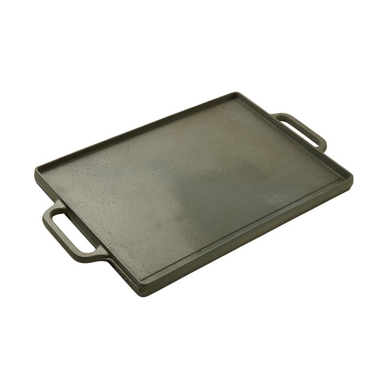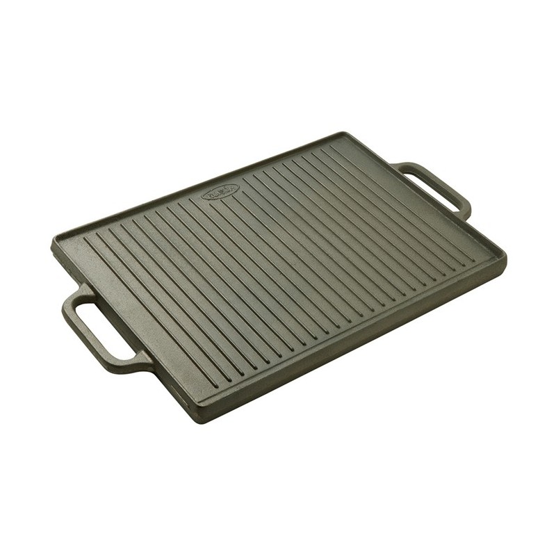 Plancha-grill en fonte, un côté lisse (plancha), un côté rainuré (grill) avec 2 poignées. Utilisable sur feux gaz.