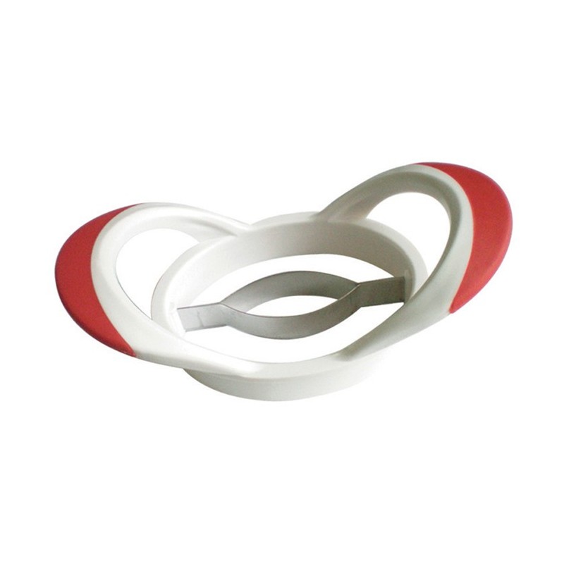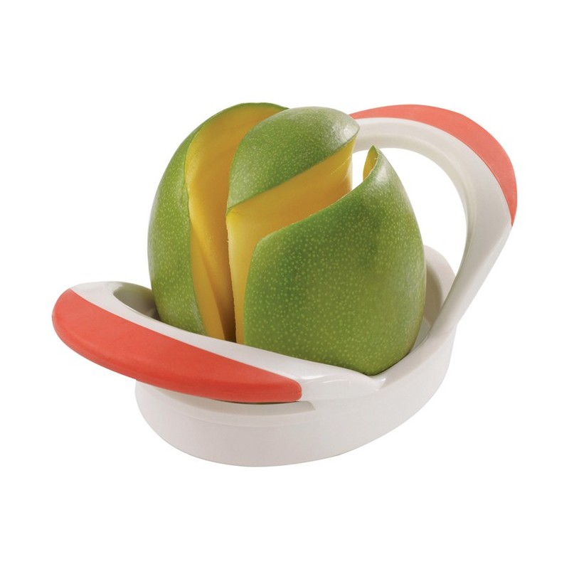 Une simple pression sur la mangue permet d'obtenir 2 moitiés de fruit avec une perte minimum.