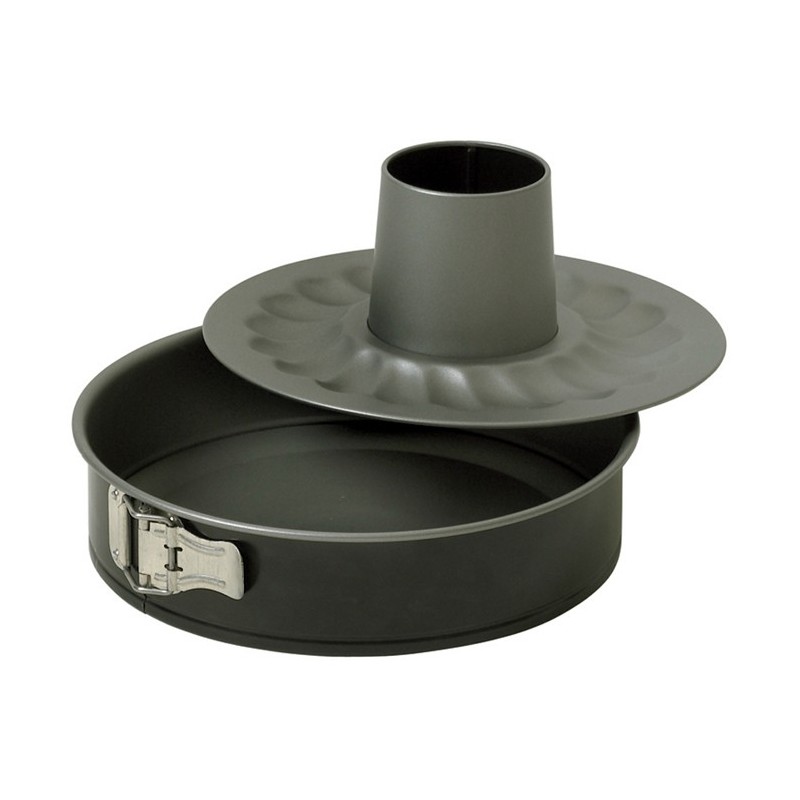 Moule démontable à charnière livré avec 2 fonds interchangeable : 1 fond plat et 1 fond à décor rosace avec cheminée centrale.