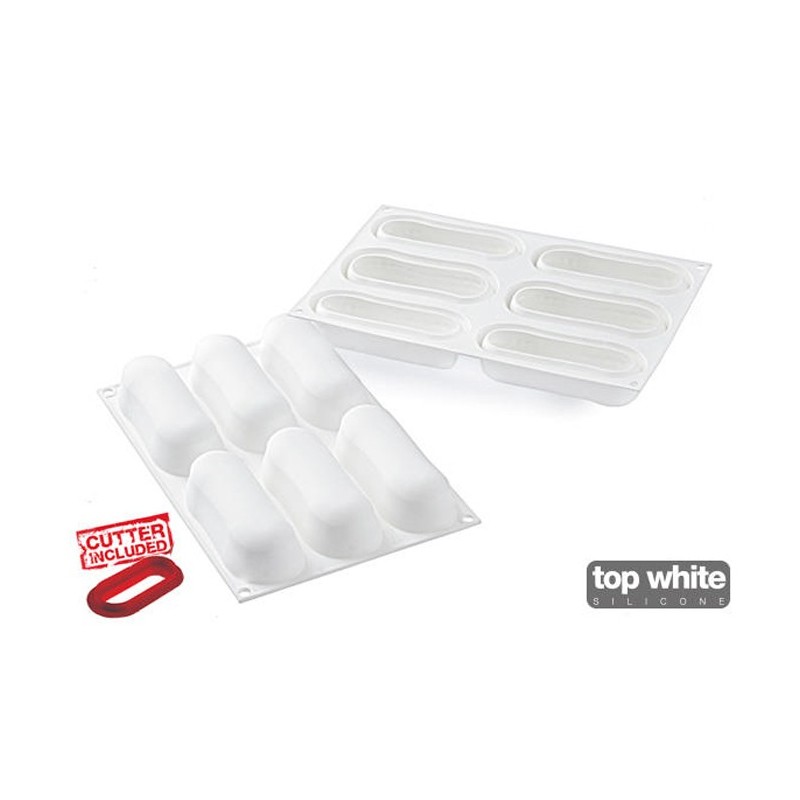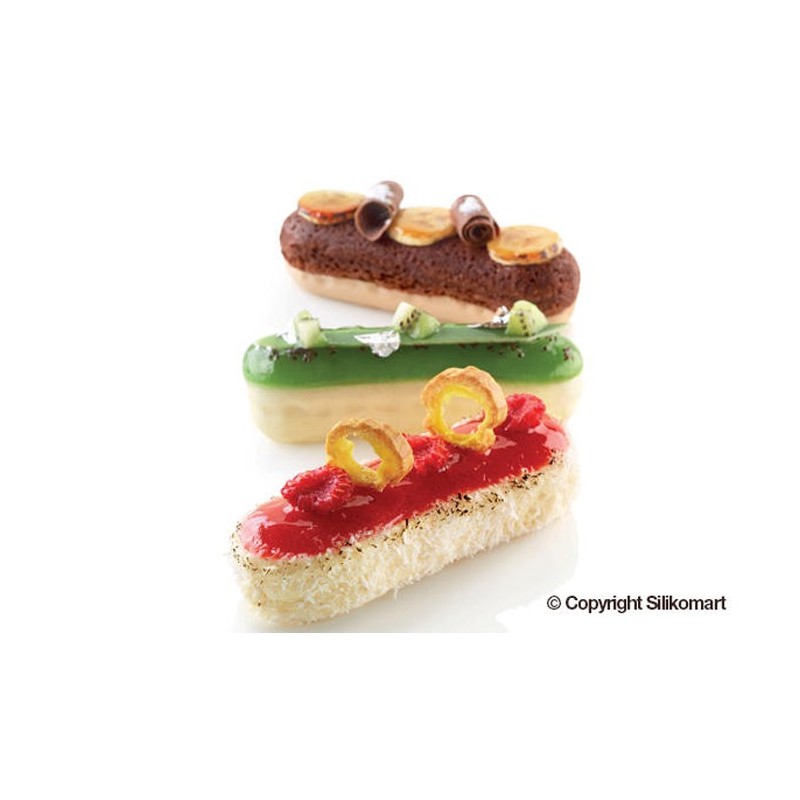 Un nouveau concept en laboratoire avec le moule multiforme Éclair140 de Silikomart Professional. Éclairs sucrés et salés en version parfait, mousse ou cuite, parfaits et tridimensionnels grâce à ce moule élégant et innovant qui permet de réaliser 6 éclairs au volume de 140 ml chacun. La confection inclut aussi un emporte-pièce fonctionnel en plastique permettant de réaliser des inserts ou des bases d’appui originaux qui s’adaptent parfaitement aux formes du moule, pour des préparations qui ravissent le regard et le palais. Grâce à l’innovante bordure sur le côté supérieur, chaque cavité du moule permet d’obtenir des éclairs à la forme parfaitement arrondie à la base. Cette technologie spéciale unie à la flexibilité de la silicone, permettent un démoulage aisé et garantissent des résultats impeccables, ainsi qu'une totale fidelité à la forme.;
