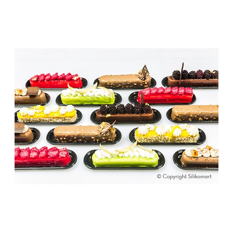 Un flash de plaisir éclairera votre vitrine. Une forme de la tradition est totalement mise à jour dans une façon où créativité et goût esthétique se rencontrent pour créer Fashion Eclair de Silikomart Professional. Un moule avec 10 cavités de 80 ml pour réaliser des parfaits et glaces avec des saveurs et couleurs les plus recherchés. Le paquet inclut aussi dix petits plats pour une parfaite présentation finale et un emporte-pièce fonctionnel en plastique permettant de réaliser des inserts ou des bases d’appui originaux qui s’adaptent parfaitement aux formes du moule, pour des préparations qui ravissent le regard et le palais.