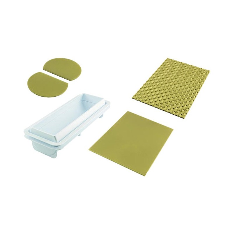 Magic Buche est le nouveau et innovanteur kit pour réaliser des bûches en version froide ou congelée... en 3D! Le kit est composé par 2 supports en plastique étudiés pour donner un effet arrondi aux créations et pour donner plus de stabilité en phase de préparation, et par deux tapis en silicone, une simple et une avec une élégante texture tressée. Le kit contient une recette.
