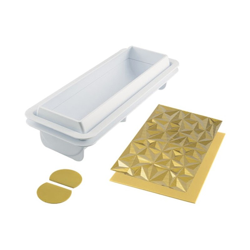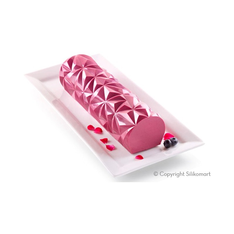 La bûche est la forme traditionnelle des fêtes et sa réalisation n'a jamais été si simple. Grâce à DIAMOND BÛCHE de Silikomart vous pourrez obtenir un résultat parfait en quelques gestes simples. Le moule se compose d'un support en plastique à l'intérieur duquel il est possible d'insérer un des deux tapis en silicone à la couleur d'or foncé, et voilà...les jeux sont faits ! Un seul support, plusieurs préparations: il vous suffira de changer le tapis pour réaliser une bûche parfaite avec des textures différentes. A l'intérieur du kit, vous trouverez un tapis lisse et un autre tapis avec une splendide texture craquelée qui couvrira votre parfait avec des diamants précieux. Un véritable bijou sur votre table.