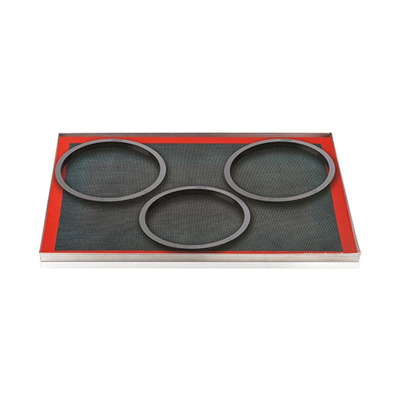 La tarte traditionnelle se pare d'une nouvelle robe grâce au Kit Tarte Rond Ø 210 mm de Silikomart Professional. Le kit est composé de deux éléments : un anneau de 210 mm de diamètre en matériau composite thermoplastique indéformable adapté à la cuisson et à la réalisation du fond et un moule en silicone de 175 mm de diamètre pour réaliser une mousse ou une crème à déposer sur la pâte sablée Pâtisserie. L'anneau est antiadhésif et inoxydable, il permet une cuisson homogène et il se caractérise par une grande stabilité thermique. La tarte créée avec le Kit Tarte Anneau Rond Ø 210 mm s'affirme comme un persistant dont la modernité classique vous laissera agréablement surpris