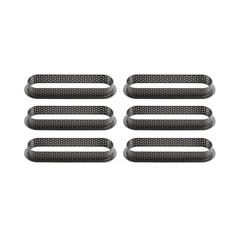 Tarte Ring Oblong 146 x 34 h 20 mm de Silikomart Professional est composé de six anneaux en matériau composite thermoplastique indéformable adapté à la cuisson et développé pour réaliser une tarte de 146 x 34 h 20 mm. Les anneaux sont antiadhésifs et inoxydables, permettent une cuisson homogène et ils ont une grande stabilité thermique, réalisant une tarte traditionnellement impeccable.